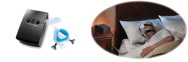 ○CPAP療法による治療。中から重症の患者さんに有効な治療です。睡眠時に専用のマスクを介して気道内に陽圧をかけ、気道の閉塞を防ぐ療法です。